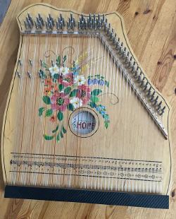 Modell 100/6 - 6 Akkordzither mit je 7 Saiten mit verstärktem Akkord und 50 Melodiesaiten als Mandolinzither (jede Melodiesaite doppelt) -Blumenmotiv als Siebdruck auf dem Korpus.- Korpus Erle Natur - Boden und Zargen schwarz - unbenutzt, wie neu, wird als "gebraucht" verkauft 350,00 EUR [30.6_7_50] ( inkl. 19% MwSt zzgl. Versandkosten)